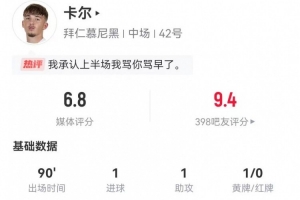 体育资讯4月4日讯 拜仁在本轮德甲3-2逆转绝杀弗赖堡,小将卡尔本场数据如下: