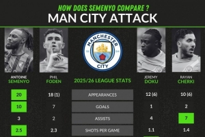 体育资讯1月8日讯 根据多家媒体的报道,伯恩茅斯边锋塞梅尼奥将加盟曼城,WhoScored统计了塞梅尼奥与几位曼城攻击手本赛季的英超数据。