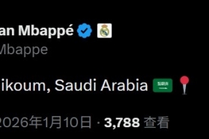 姆巴佩通过社媒发文:“Salam Alaikoum(阿拉伯语‘你好’),沙特阿拉伯”,同时还附上了沙特国旗和定位符号。