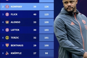 体育资讯1月13日讯 德转更新执教德甲前50场所获积分排名,孔帕尼拿到126分位居第二。