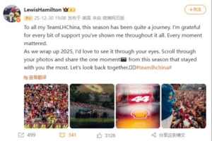 汉密尔顿微博写道:致我所有的中国车迷,这个赛季是一段不平凡的旅程。感谢你们一直以来对我的支持,每一刻都意义非凡。随着2025年的结束,我想通过你们的视角来回顾这一年。翻阅你们的照片,分享本赛季最让你难忘的一刻📸。让我们一起回味这段时光。