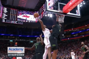 黄雀在后!詹姆斯奋力追防 高高跃起送阿巴基钉板大帽