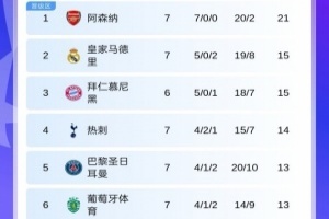 第7轮首个比赛日过后,阿森纳7战全胜领跑,皇马暂升第2,曼城不敌博德闪耀后跌至第7,国米遭遇三连败后跌出前8,暂时来到第9位。