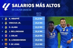 体育资讯1月24日讯 德国转会市场盘点了本赛季西甲球员年薪情况,姆巴佩以3130万欧元居首,维尼修斯以2500万欧元位居次席,前四均为皇马球员。
