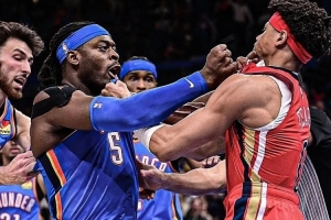雷霆和鹈鹕的比赛最后时刻,场上却突然发生冲突:站在战场中央的两位,一个是全联盟顶级恶人多尔特,而另一位,却是一个比他足足轻了30斤的新秀,杰里米亚-费尔斯。