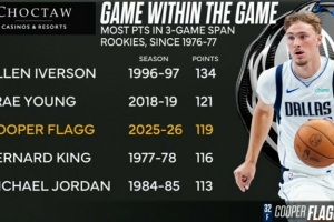 过去三场比赛弗拉格合砍119分,是自76-77赛季新秀连续三场得分之和的第三高,仅次于艾弗森和特雷·杨。