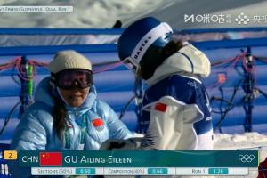 谷爱凌首跳出现失误意外摔倒,她的妈妈在场边拥抱安慰女儿