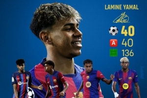 据《世界体育报》统计,18岁亚马尔为巴萨出战136场比赛,已贡献40粒进球和40次助攻。