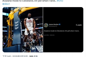 哈登晒图并写道:“飞行模式,前往克利夫兰,落地后联系你们。”