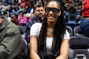 鹈鹕官推晒出了WNBA王牌队巨星阿贾·威尔逊场边看球的照片。她应该是来支持自己的男友,热火中锋阿德巴约。