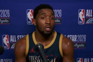 体育资讯2月16日讯 NBA全明星正赛冠军赛,美国星条队21-47不敌美国新星队,赛后,多诺万·米切尔接受了记者采访。