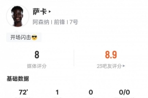 体育资讯2月19日讯 英超第31轮,阿森纳客战狼队。萨卡首发登场,打进1粒进球,5次过人均成功,送出1次关键传球,评分8.0。