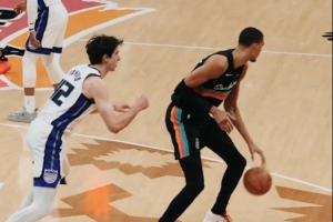 在本场比赛中,文班亚马面对雷诺左手胯下运球过人后接扣篮终结。