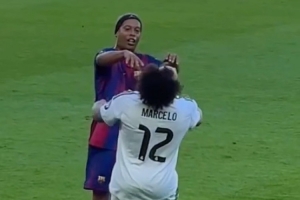 巴萨传奇队vs皇马传奇队的表演赛在美国洛杉矶进行,比赛中小罗开玩笑推搡马塞洛,后者顺势倒地,复制了昔日国家德比的“火药味”。