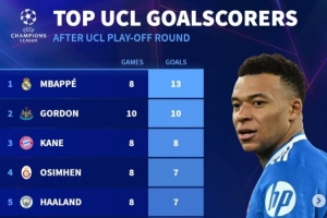 体育资讯2月26日讯 欧冠淘汰赛附加赛已经完赛,《转会市场》也统计了本赛季欧冠射手榜,姆巴佩居首。