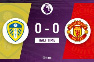 第35分钟,利兹联右路传中,前点勒温甩头攻门!皮球击中后侧立柱!曼联逃过一劫↓