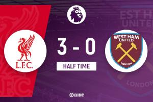 上半场伤停补时4分钟,半场结束,利物浦暂3-0西汉姆联。