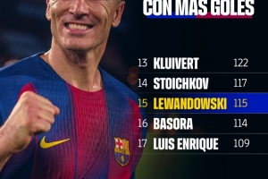 如今,莱万已经为巴萨打进115球,超越巴索拉位居队史射手榜第15位,仅落后第14位的斯托伊奇科夫两球。