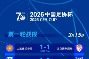 体育资讯3月15日讯 2026年足协杯第一轮第三个比赛日结束,北京通州鹏瑞、宁夏平罗恒利、武汉联镇、聊城传奇绿业春、泉州青工走走纺织五支球队晋级。