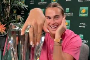 赛后萨巴伦卡拍视频:我终于拿到印第安维尔斯这个大奖杯,我非常激动、超级开心。谢谢大家的支持,这里真的是网球天堂。很高兴把这座美丽的奖杯加入我的收藏品之列。这周对我也很重要对吧?