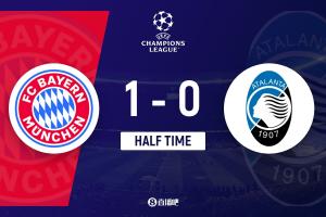上半场补时3分钟。半场战罢,拜仁1-0亚特兰大。