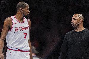 杜兰特本场比赛依旧受困于包夹,上半场仅3中1得2分。虽然第三节复苏6中5得到13分,但末节杜兰特再次消失,仅2中1得3分。