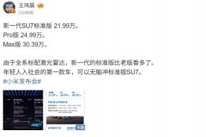 体育资讯3月19日讯 小米春季新品发布会,新一代SU7正式登场,其中标准版21.99万,Pro版24.99万,MAX版30.39万。