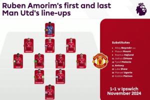 体育资讯01月07日讯 英超官方社媒晒图,对比了阿莫林执教曼联首战和最后一战的首发,并且发问:“你注意到什么了?”