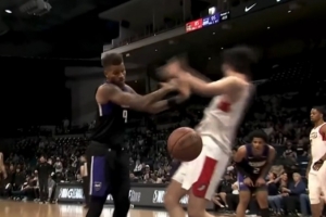 GIF-杨瀚森扣篮后被丹尼斯推倒,倒地后微笑