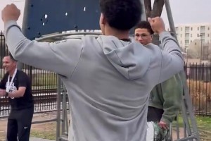 比赛时间走完东契奇投个半场 伊森从替补席助跑一把将球打飞场外